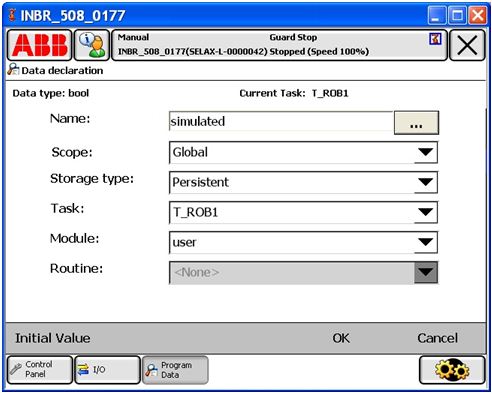 Global Persistent RAPID data "simulated" of data type "bool" in task "T_ROB1" "user" module". Initial value: false.