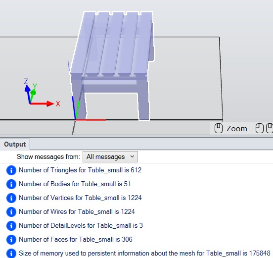 This example provides information on the number of Triangles, Bodies, Vertices, Wires, DetailLevels, Faces, Size of Memory used to persist CAD data.